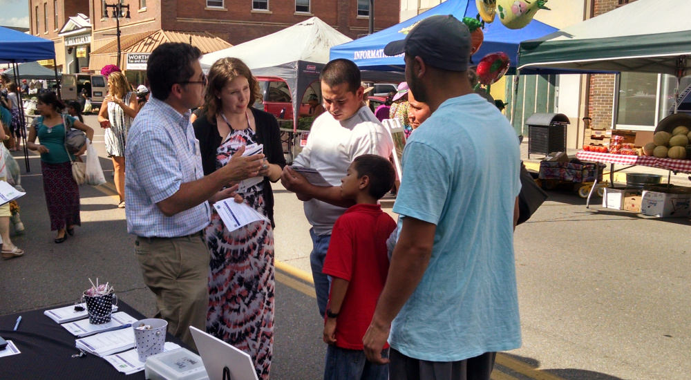 Engaging with community members at a farmer's market event in downtown Worthington.